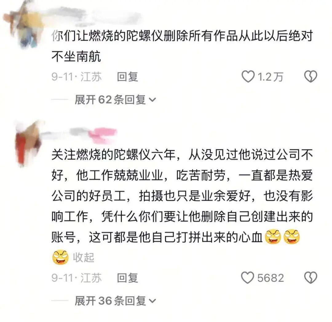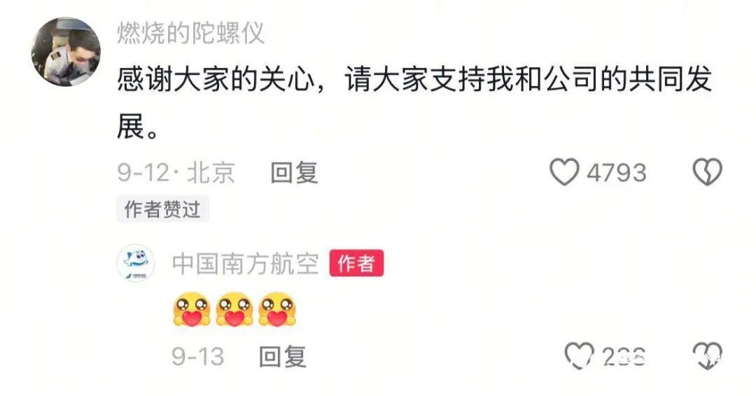 9月12日,燃烧的陀螺仪在南方航空视频下方评论称,感谢大家的关心,请大家支持双方的共同发展,南方航空官方账号则回复了三个送心的表情。同日,燃烧的陀螺仪在个人账号发文称“沟通清楚了,挺好的,感谢!”