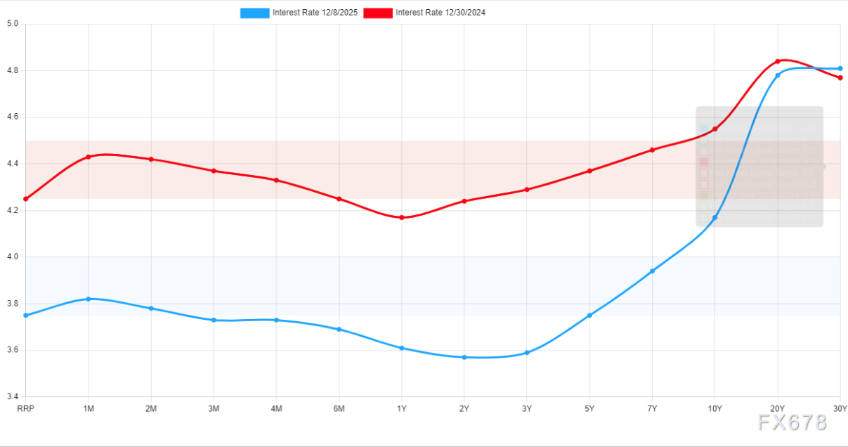 (U型收益率曲线,显示今年连续降息后美国国债收益率曲线下移但陡峭化)